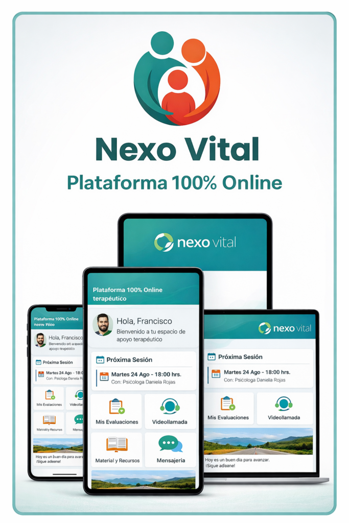 Nexo Vital entrega sus servicios de forma 100% online, a través de una plataforma digital segura, permitiendo el acceso al acompañamiento profesional desde cualquier lugar, sin reemplazar atención médica de urgencia ni hospitalaria.